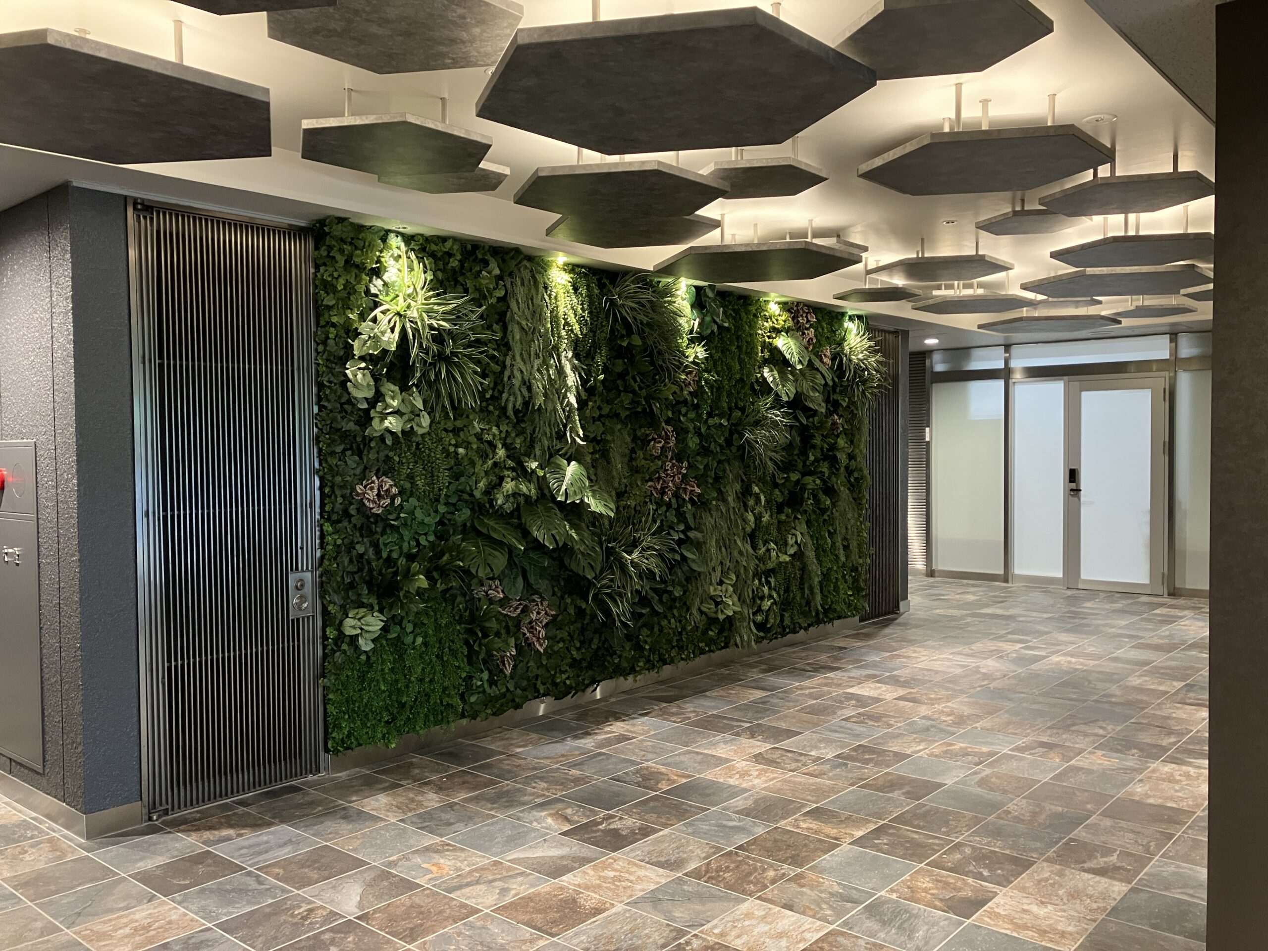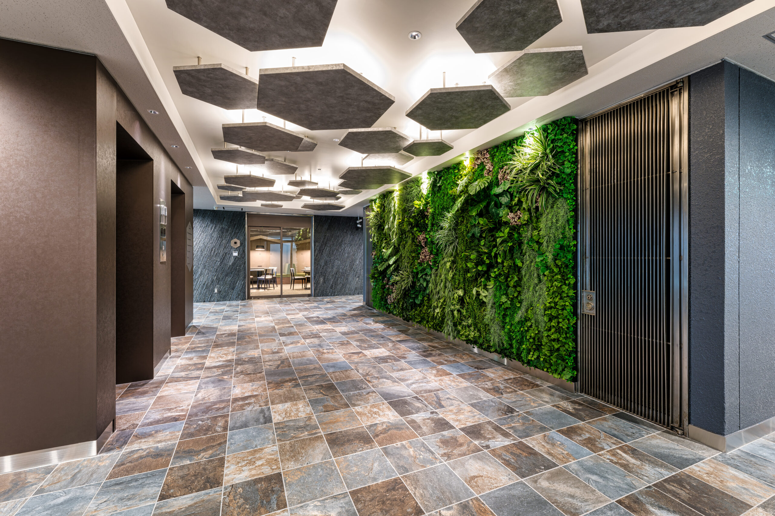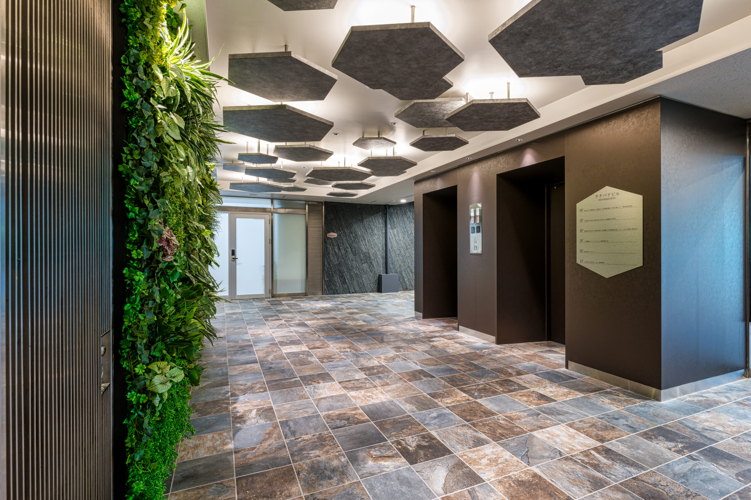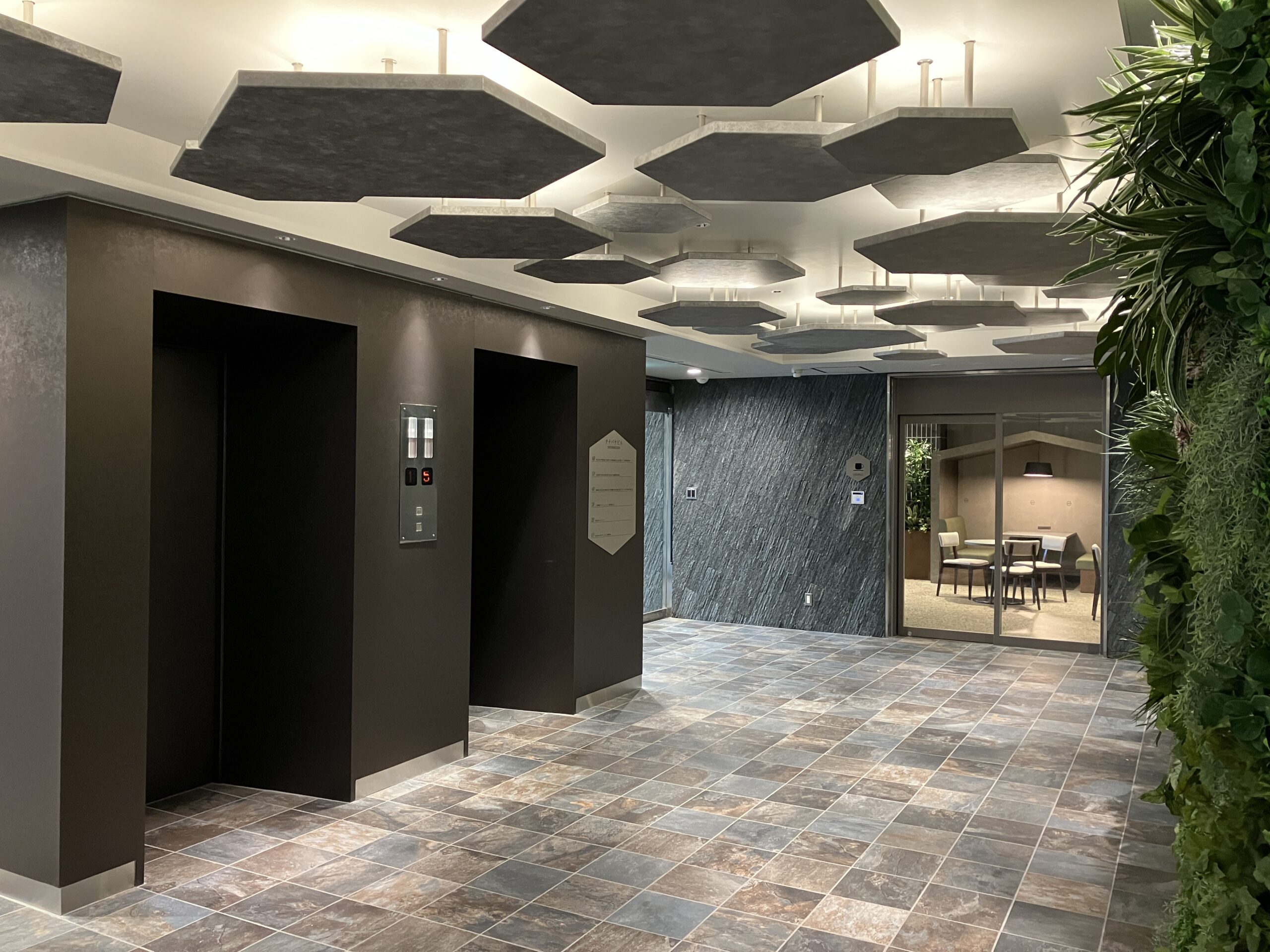エントランスの天井パネルは大小さまざまな大きさで高低差のある正六角形のパネルの隙間から照明の光が差し込む設計となっており、EVホールをとても柔らかい雰囲気にしています。