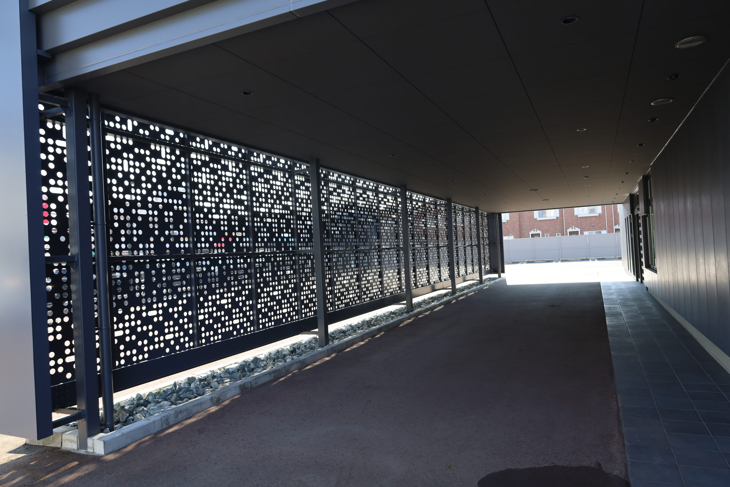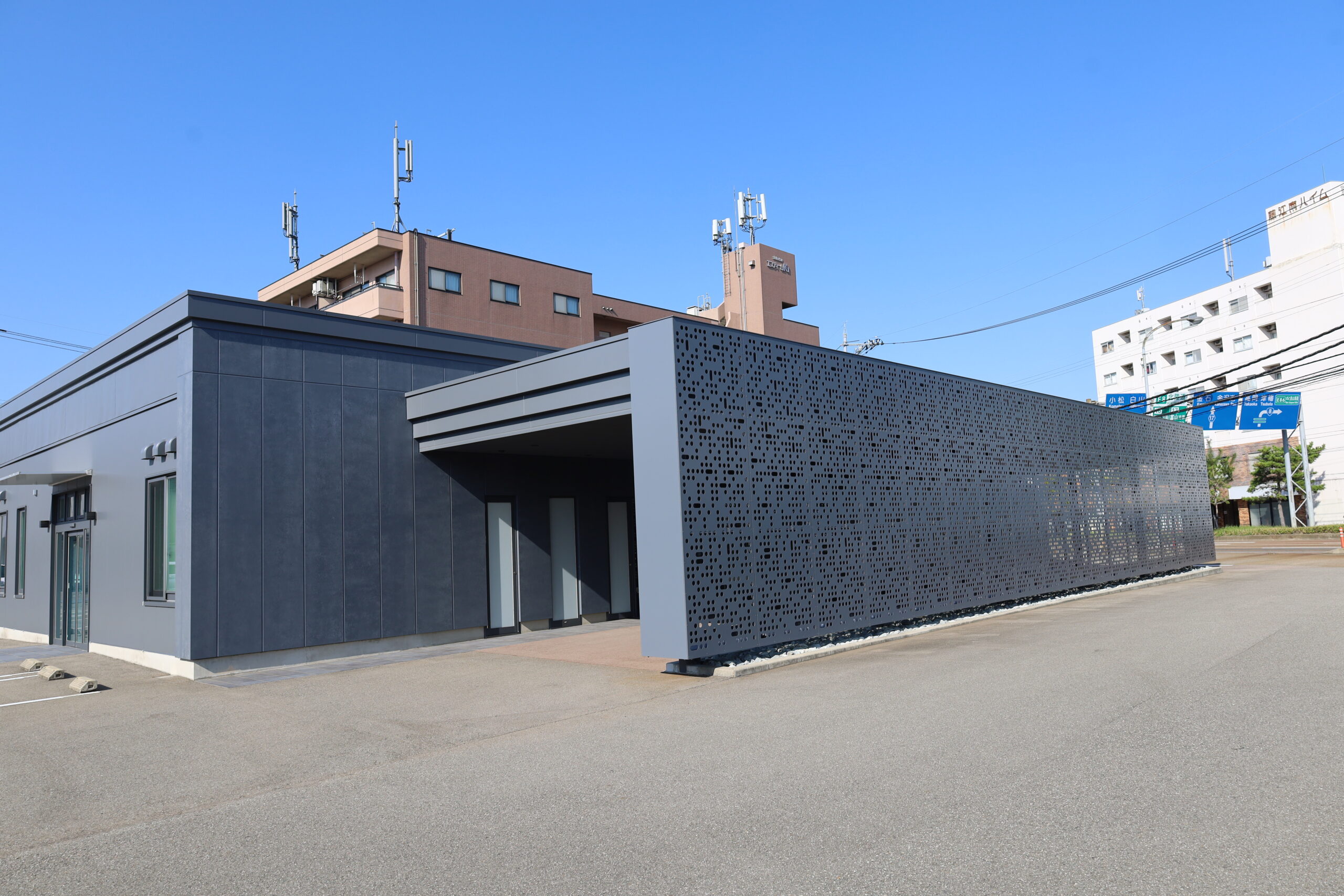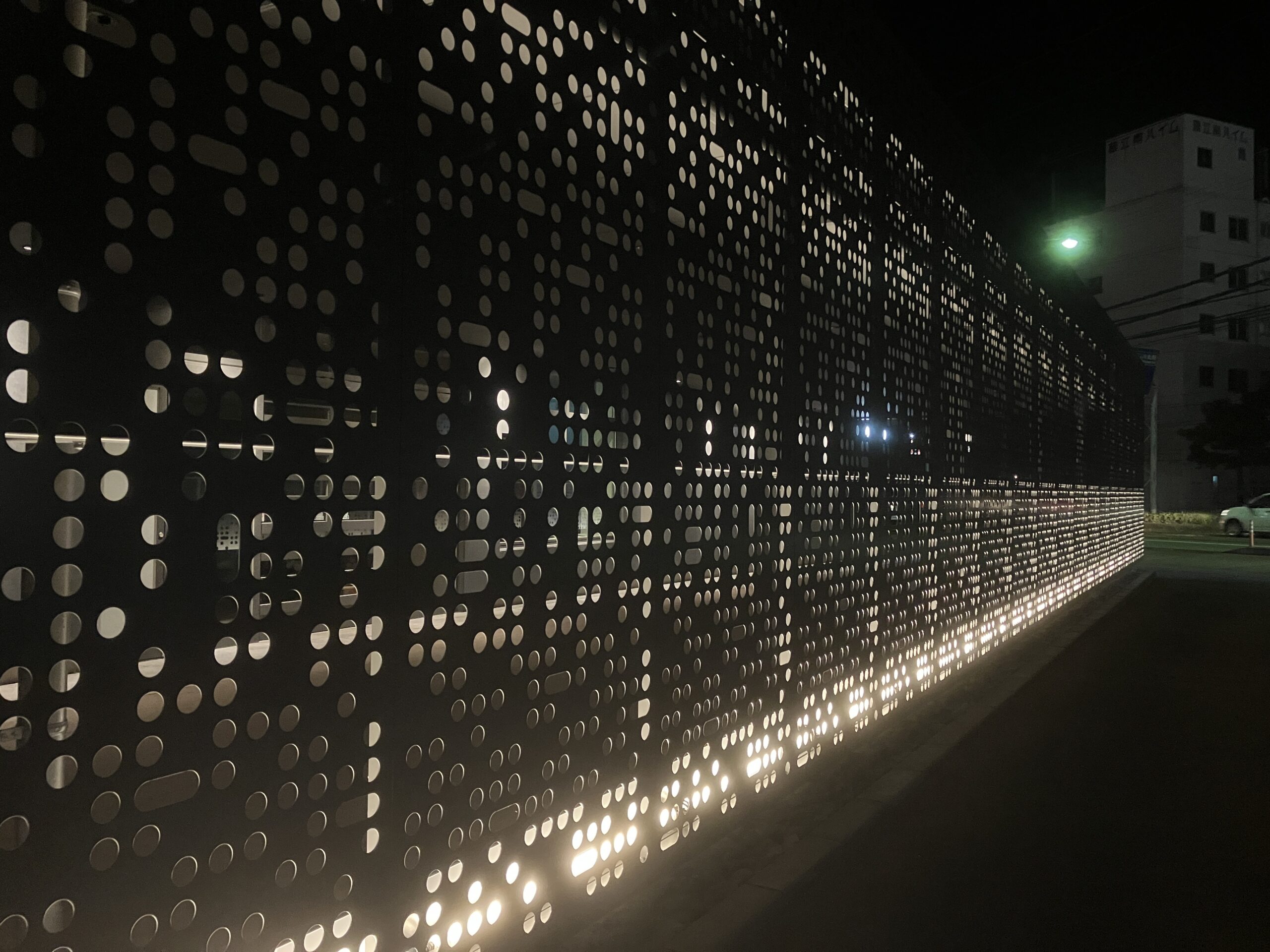建物正面の目隠しも改修前はガラスでしたがパンチングパネルを取り付けることで目隠しの機能を果たしつつとても柔らかい光が入るようになりました。
